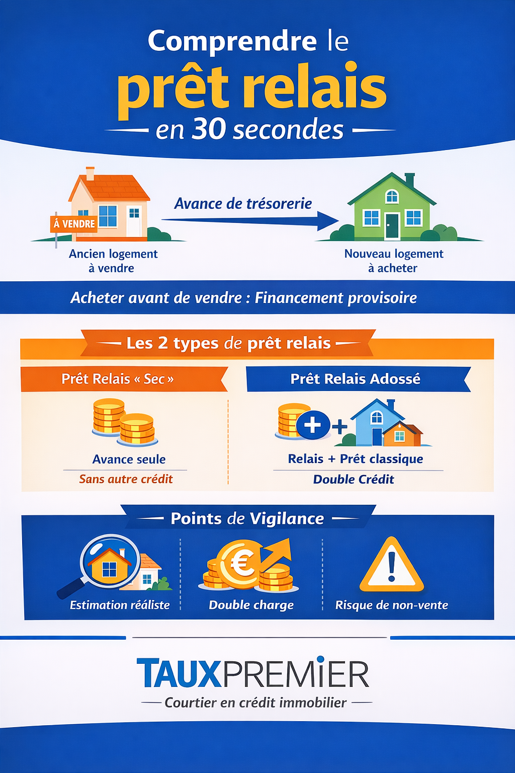 Le prêt relais est un crédit immobilier de courte durée, généralement compris entre 12 et 24 mois, permettant de financer une nouvelle acquisition dans l’attente de la vente du bien actuel.